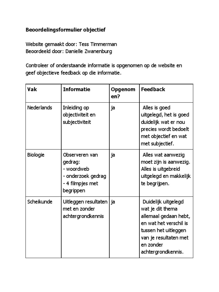 Beoordelingsformulier Objectief Voor Tess